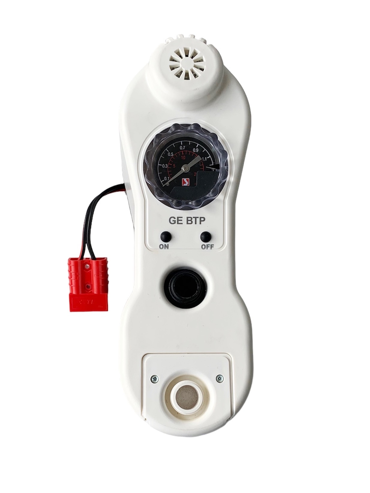 De GE BP-2 elektrische luchtpomp werkt op 12 volt en via de centrale draaiknop kan de gewenste luchtdruk worden ingesteld.